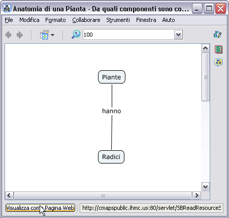 Cliccando sul bottone "Visualizza come Pagina Web", CmapTools lancerà il browser predefinito e aprirà la versione come pagina Web della Cmap attiva (che rimarrà aperta sotto la pagina web). In alternativa si può selezionare il lungo indirizzo trascinando il mouse su di esso, quindi utilizzare la combinazione rapida di tasti Ctrl+C per copiarlo e incollarlo nella barra degli indirizzi del browser preferito.
