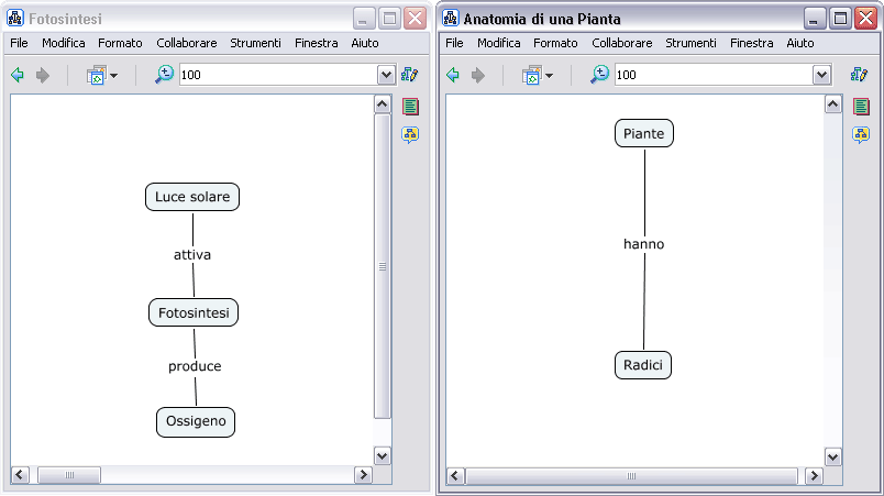 Successivamente sarà possibile navigare aprendo una qualsiasi delle mappe collegate. Cliccando sul link dei concetti di collegamento si apriranno le mappe ad essi collegate.