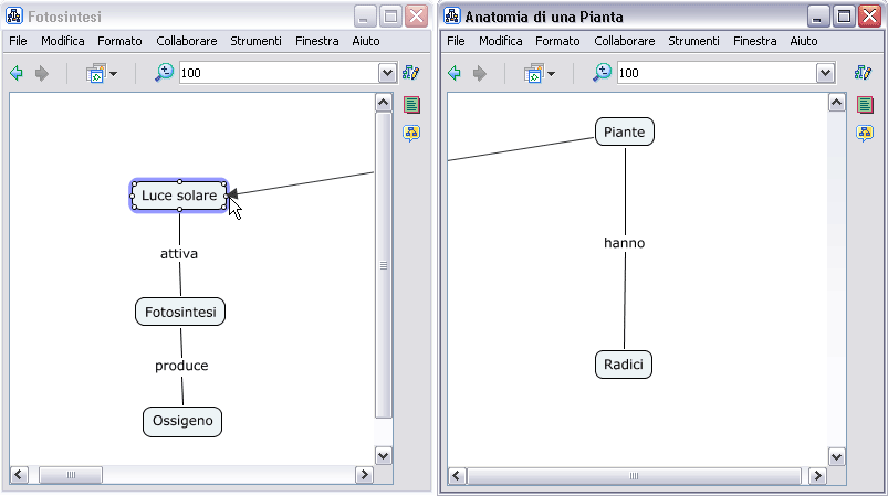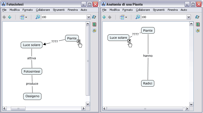 Due o più Cmap possono collegate ad una terza e tra loro allo stesso modo in cui diversi concetti possono essere uniti all'interno della stessa Cmap. Cliccare col tasto sinistro sulle freccette del rettangolino sopra al concetto della Cmap "A" (a destra nell'esempio) e trascinare la linea di collegamento fino alla posizione desiderata della CMap "B" (in un'area libera o su un nodo preesistente) esattamente come si farebbe per creare una proposizione nella stessa Cmap.