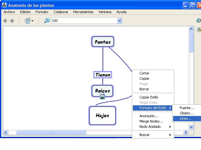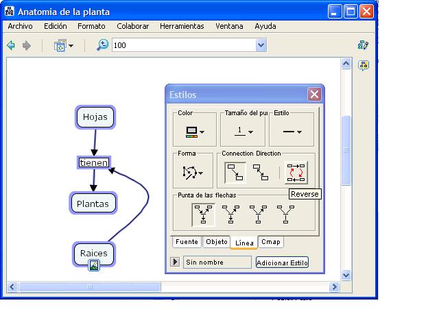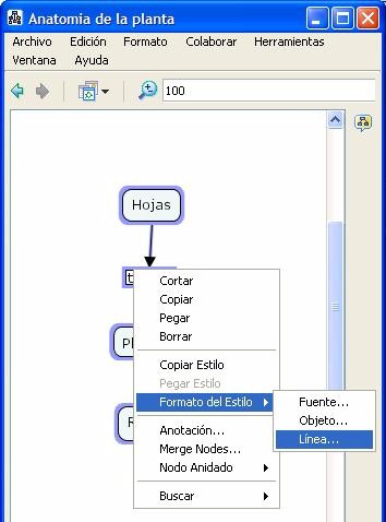 El orden en el cual los conceptos se crean para las proposiciones afecta a la dirección de las flechas de las lineas de enlace. Las proposiciones no pueden mostrarse lógicas hasta que la dirección de las flechas sea correcta. Para cambiar la dirección de las flechas, comenzaremos seleccionando las lineas de enlace. Con el botón derecho nos aparecerá un menú, con el botón izquierdo seleccionamos la opción Línea del sub-menú Formato del Estilo.