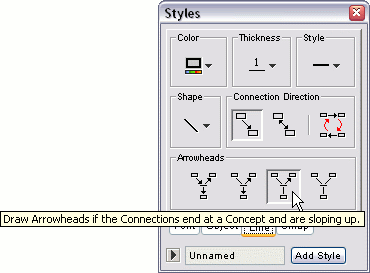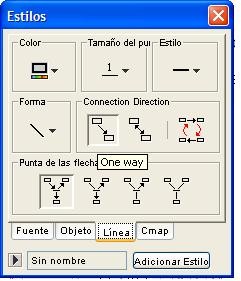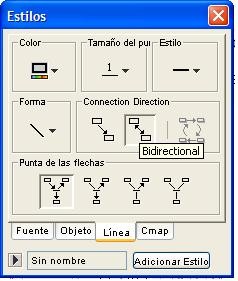 Puede cambiar el énfasis en la dirección entre las proposiciones utilizando flechas. Para cambiar como son usadas las flechas entre las proposiciones, comience seleccionando la(s) proposición(es). Seleccione un área con el ratón usando el botón izquierdo, click con el botón derecho sobre un concepto o línea, elija la opción Línea que aparece en el sub-menú de Formato del Estilo. (Si quiere puede modificar sólo una línea haciendo click con el botón derecho sobre ella. En la ayuda de la sección Cambio de Color se explican diferentes métodos de selección de términos en Cmap, incluyendo las líneas de enlace.)