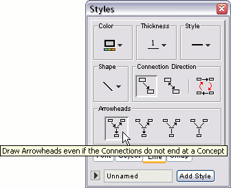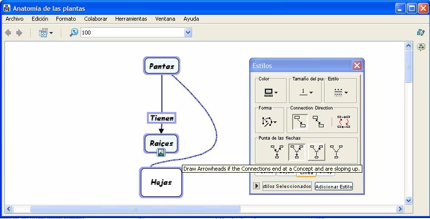 Puede hacer que las flechas apunten del concepto padre a los nexos de las frases, y de los nexos de las frases a los conceptos hijos. Para crear este tipo de flechas, click con el botón izquierdo en la opción que vemos en Punta de las Flechas (Arrowheads).