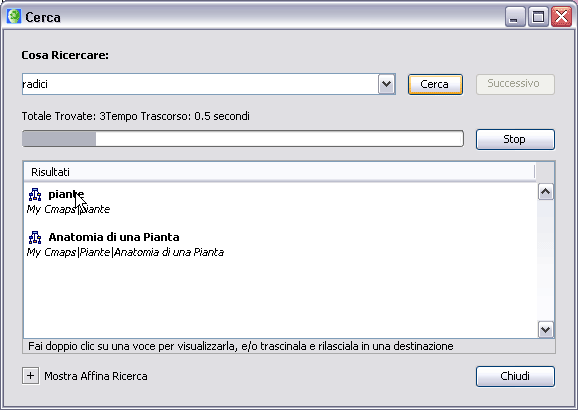 Lo strumento Cerca individuerà i termini cercati nei concetti e nelle frasi legame, che appariranno già selezionati.