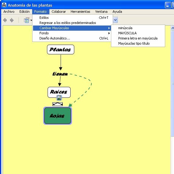 Puede modificar el formato del texto en el Cmap. El Cambio de Mayúsculas aparece como sub-menú de Formato que se encuentra en el menú principal del programa