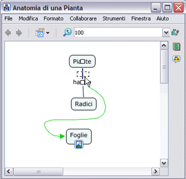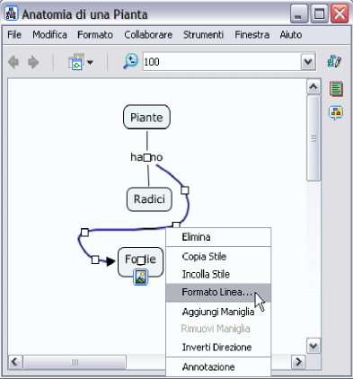 È possibile modificare il colore di tutti gli oggetti di una Cmap, ad eccezione dell'icona del gruppo di collegamenti alle risorse, (descritta nella sezione della guida: Trascinare Risorse). Per cambiare il colore di una linea di connessione, selezionarla cliccando col tasto destro, quindi cliccare Formato Linea... col sinistro dal menu che appare. (Notare che una linea di collegamento può avere una forma diversa da un segmento rettilineo. Maggiori informazioni sui diversi tipi di linee di connessione possono essere trovati nella sezione della guida Modificare Linee di connessione.)