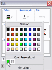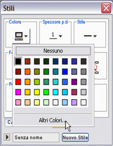 La finestra "Stili" si aprirà sulla scheda Linea o sulla scheda Oggetto, a seconda del sotto-menu scelto. Una volta cliccato col sinistro il pulsante Colore, controllare la presenza di Colori Personalizzati. Cliccando col tasto sinistro un colore della tavolozza si modificheranno i colori di tutti gli oggetti selezionati.