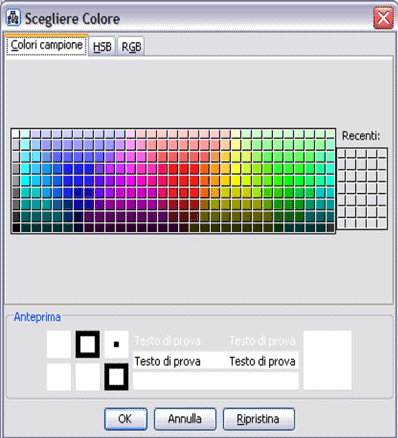 Dalla finestra "Altri Colori" si può aprire la scheda di dialogo Colori campione dove è possibile prelevare un colore da una tavolozza espansa. Il colore attualmente n uso appare nel pannello di Anteprima. I colori del pannello precedentemente usati e selezionabili si trovano sulla destra, sotto l'intestazione Recent:.