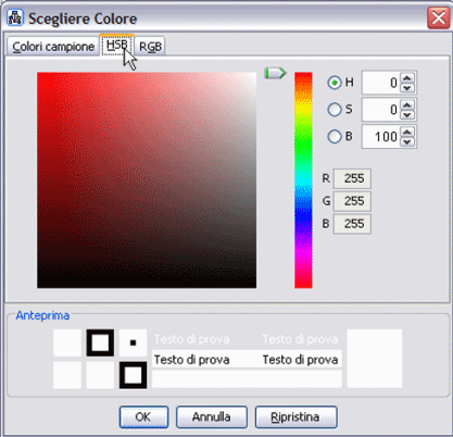 Un clic col sinistro sul tabulatore HSB nella parte alta della finestra consente di esplorare altre opzioni per la scelta del colore.