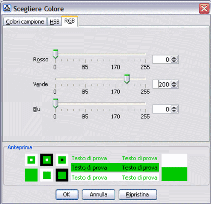 La scheda di dialogo RGB permette la scelta del colore attraverso l'aggiustamento della terna di valori di Rosso (R), Verde (G) e Blu (B), facendo scorrere i cursori orizzontali, gli indicatori numerici o tramite combinazioni di tali azioni. Una volta scelto il colore (visibile dal pannello di Anteprima), cliccare col sinistro il bottone OK e infine riscontrare il cambiamento dell'oggetto della mappa.