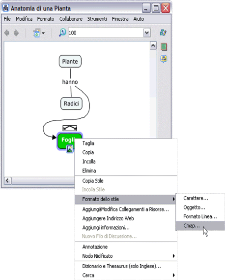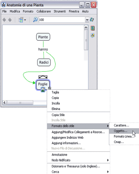 Per modificare il colore di un singolo concetto, selezionarlo con un clic del tasto destro, quindi cliccare col sinistro su Formato dello stile. Si ottiene un sotto-menu da cui si sceglie Oggetto... col tasto sinistro..