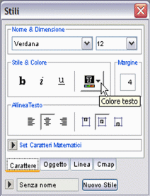 Si aprirà la finestra "Stili" con la scheda dialogo del Carattere in evidenza. Cliccando col sinistro sul pulsante Colore Testo si avrà la possibilità di scegliere colori.