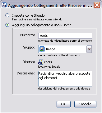 Se la risorsa trascinata è un'immagine, potrà essere rilasciata sia su una parte bianca della mappa (di cui diverrà lo sfondo) sia su un nodo. Gli altri tipi di risorsa potranno essere rilasciati solo su un nodo (concetto o frase legame). Portando la risorsa - immagine sul concetto e rilasciando il mouse si ottiene l'apertura della finestra "Modifica Collegamento alla Risorsa", con la possibilità di impostare l'immagine come sfondo del nodo oppure come collegamento. La scelta tra le due opzioni è effettuata con la selezione dell'opzione in alto: "Aggiungi come sfondo" o "Aggiungi collegamento alla risorsa". I campi Descrizione e parole chiave consentono l'aggiunta di informazioni aggiuntive sulla risorsa. Se la risorsa non č un'immagine sarā inseribile solo come collegamento. L'inserimento definitivo si ha cliccando su OK nella finestra di Modifica Collegamento alla Risorsa.