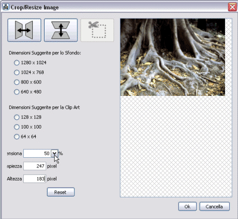 L'immagine č stata ridotta al 50%. Sono possibili anche operazioni di ribaltamento, orizzontale o verticale e di ritaglio.