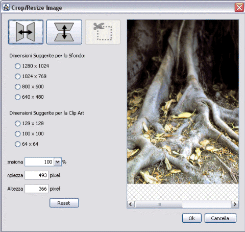 Il bottone Resize/Crop permetterā di ridimensionare o ritagliare