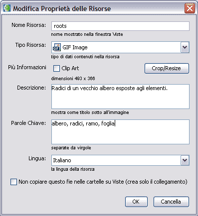 Dopo aver rilasciato il mouse nella finestra "Viste - CmapTools" si aprirā una finestra "Modifica Proprietā delle Risorse". Cliccare su OK una volta completate le modifiche alle proprietā.